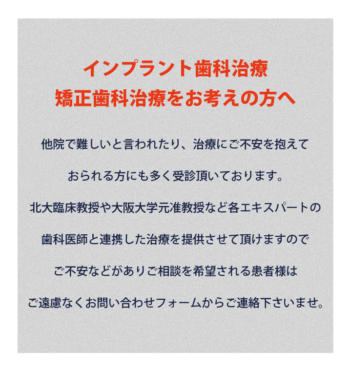他院でインプラント歯科治療や矯正歯科治療が難しいと言われた方も、北大臨床教授や各エキスパートの歯科医師と連携した世界水準の治療を受けて頂けます。